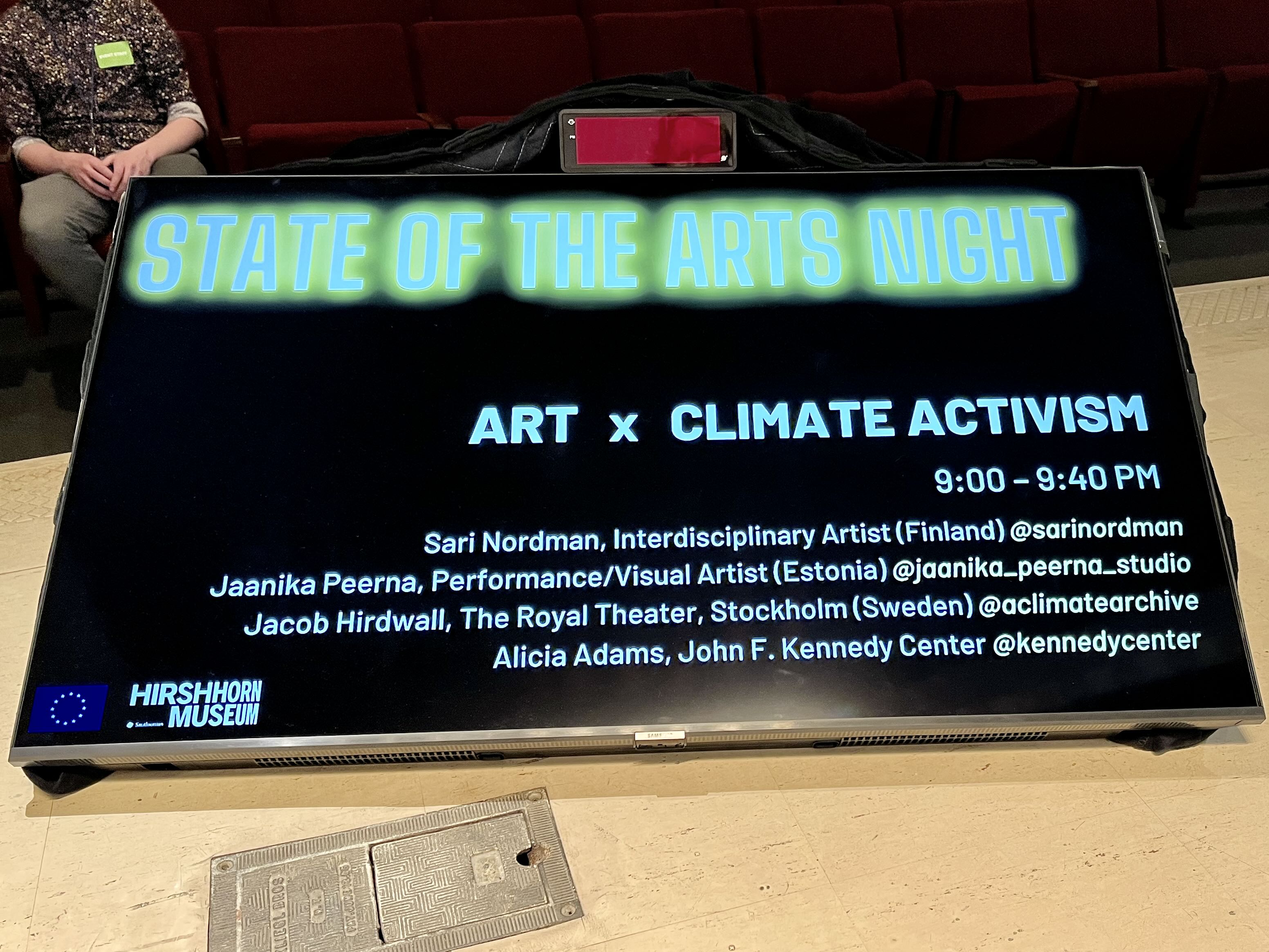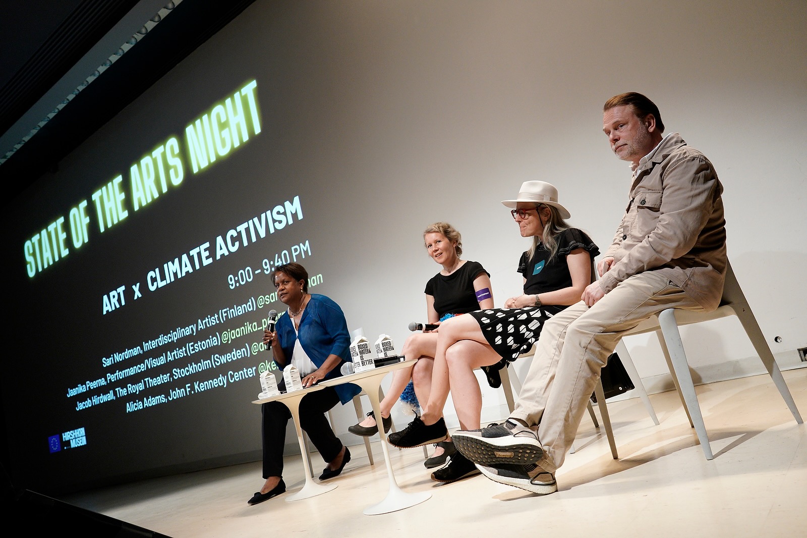A panel discussion “Art x Climate Activism” as part of State of the Arts Night by the Delegation of European Union to the US at Hirshhorn Museum, Washington DC, 2023. Supported by The Embassy of Finland in Washington DC. More information on State of the Arts Night